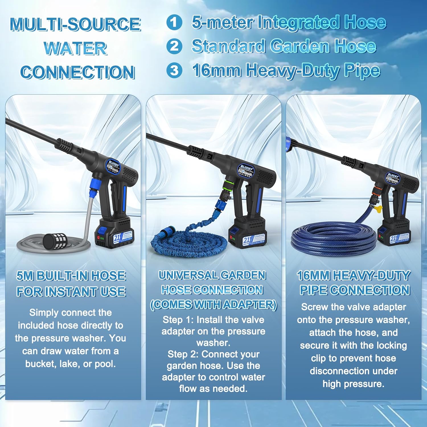 La gâchette à modulation de pression vous offre un contrôle intuitif et immédiat : plus vous appuyez, plus le jet est puissant. Besoin d’un jet doux pour les surfaces fragiles ? Ou d’un flux intense pour décoller la saleté incrustée ? Avec Blucky, c’est vous qui décidez en temps réel, sans perdre de temps à changer de réglages.
